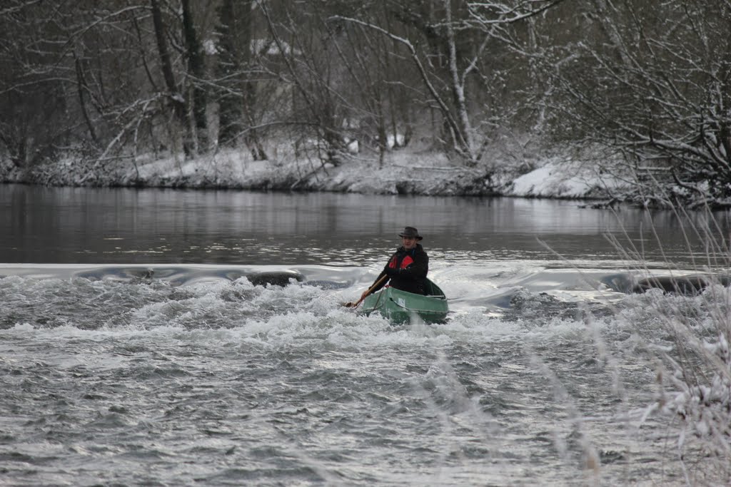 Sicher ist auch, dass der "Fun-Faktor" im Wildwasser ganz wesentlich von den Größenverhältnissen zwischen Boot und den Spielflächen abhängt. Hier ist ein 5m-Ally eindeutig mehr das Abfahrtboot, welches eher unbeeindruckt von größeren Löchern, Pilzen und Wellen durch das weiße Wasser gleitet. Durch die Flexibilität des Rumpfes passt sich dieses Schiff auch so sehr dem Wasser an, dass die klassischen Einschläge im Bug- oder Heckbereich einfach nicht stattfinden. Dafür gibt's dann ab und zu mal eine Kniemassage. Deren Auswirkungen auf das Boot sind jedoch nahezu uninteressant, da in dieser Zone der maximale Auftrieb und somit minimales Eintauchen gewährleistet ist. Auch ist sicher, dass der Hüftschwung eines 98 cm breiten Bootes anders aussieht als der eines 70cm breiten Wildwasserkandiers. Denn Kanten ist in dem Ally eine Frage des Ganzkörpereinsatzes. Wer es nicht glaubt, sollte sich mal überlegen, wie groß der Höhenunterschied zwischen zwei Knien ist, die ca. 40 cm (Salsa) respektive 80 cm (Ally) auseinanderliegen und das Boot um 45° gekippt wird! Im Ally sieht man in diesem Fall gerade noch so über den hochgestellten Süllrand.